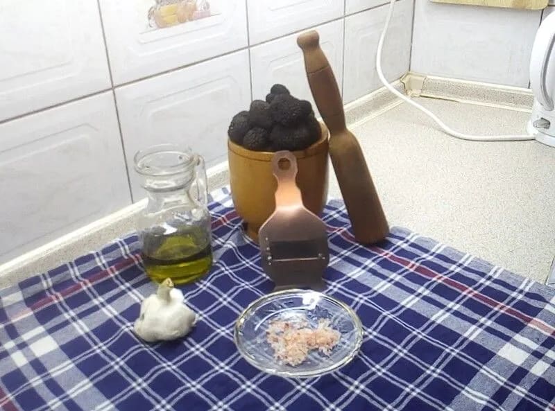 There are no precise weights or quantities, you have to play it by ear and create the paste according to your own taste. Here I used 1.5 kilos of truffle and around 250 ml of olive oil. Then I seasoned with just under a teaspoon of coarse Himalayan salt and a large clove of grated garlic.