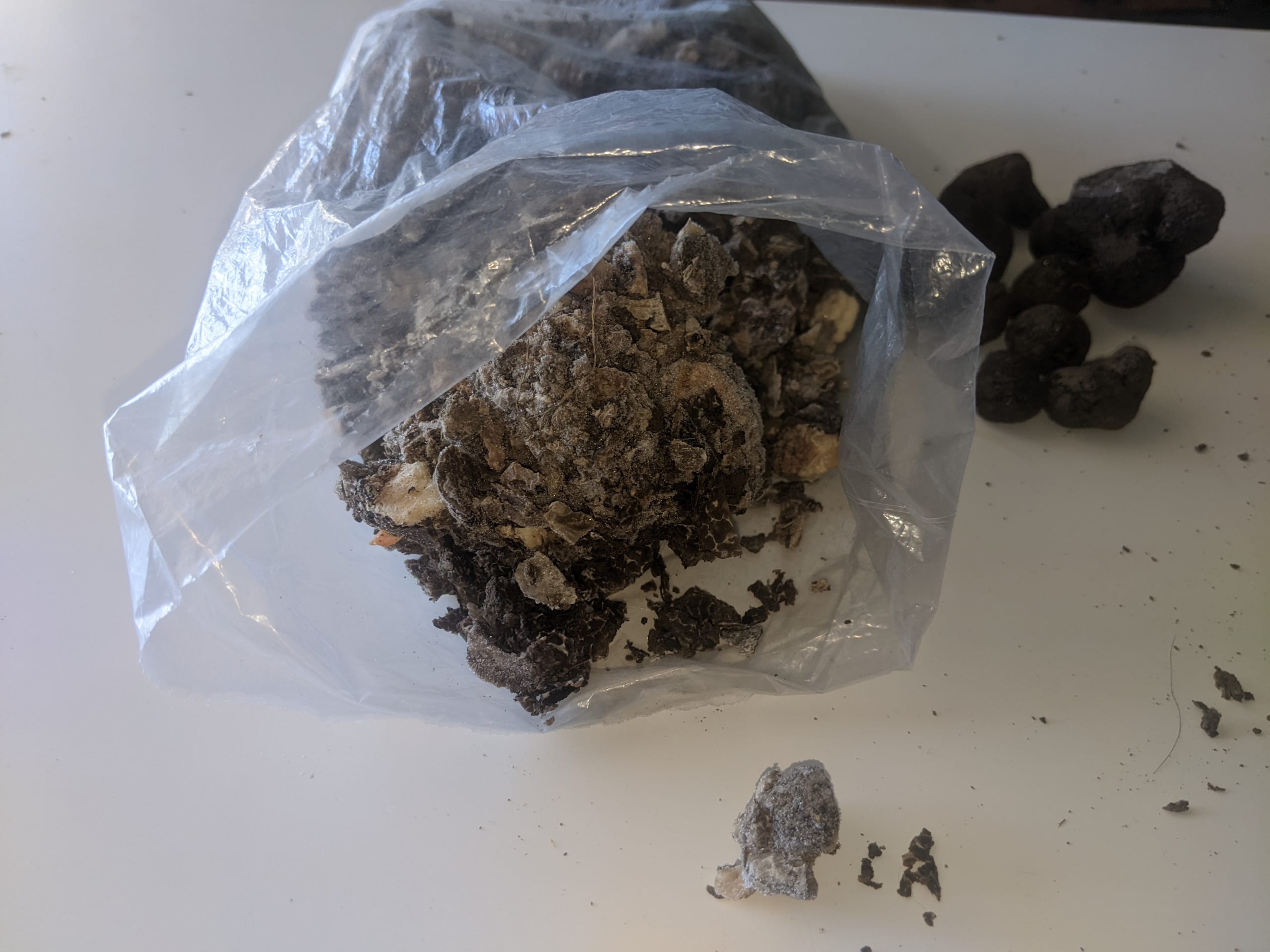 Now that the earth is ready and we have our young trees, it is time to prepare a slurry. This is a mixture containing the key ingredient: truffle spores. These spores are found in the gleba or flesh of mature truffles. During the season we end up with lots of pieces left over from the process cleaning and cutting the truffles we collect. These scraps are dried or frozen and are full of millions of truffle spores. The more mature the truffles, the better quality of the spores, so if possible use later season truffle scraps. If you don’t have access to truffle cuttings, spores can be bought online for around 20 pound. If you are struggling to find spores, contact me. If you live in Europe, I might be able to send you some of our scraps.