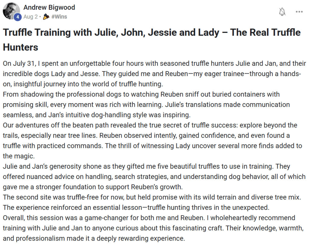 As we are primarily truffle hunters, we can only take on a very small number of students each year, so we don’t advertise this training widely. Rather we offer it quietly to those who are serious about learning and who value a relationship-based approach to truffle dog work. An approach where trust, connection and consistency are just as important as the end goal.